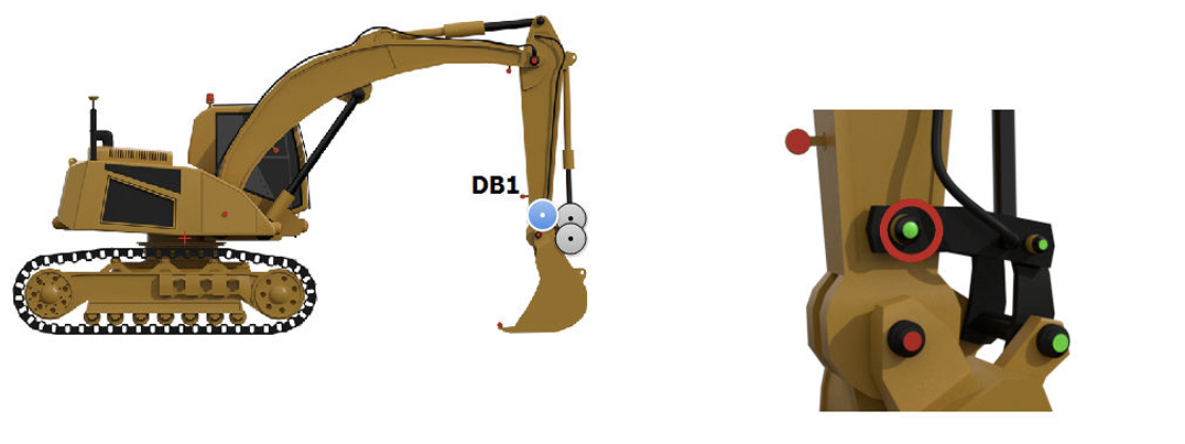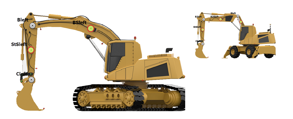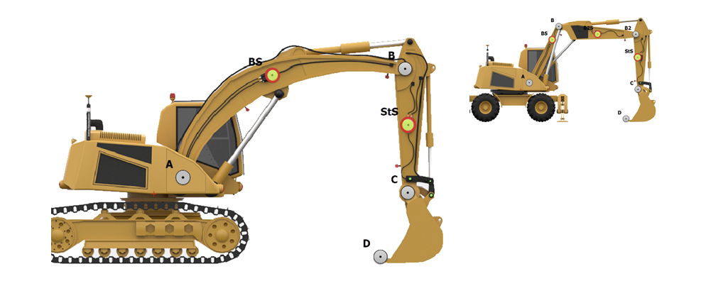 ➜ When calibrating cylinder points on Dual Boom Excavators, always the cylinder points of 'boom 1' are used, never the points of 'boom 2'.