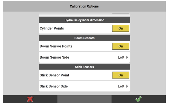 - To include the Boom Sensors and Stick Sensors in the calibration procedure, set the options to On.
