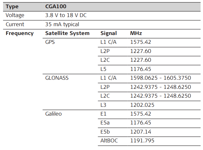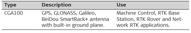 Description and use: The GNSS antenna is selected for use based upon the application. The table gives a description and the intended use of the antenna.