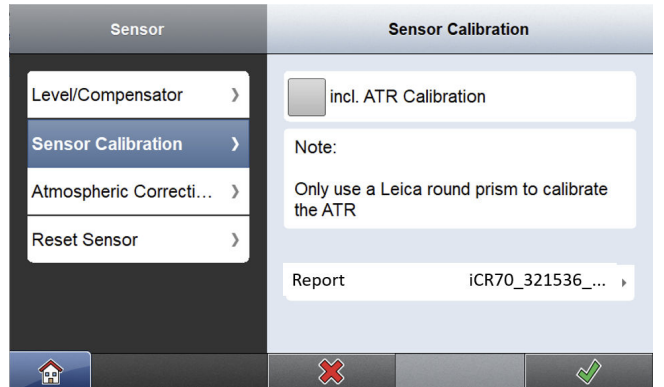 ➜ When being connected to an iCR50 or a iCR70/iCR80S via the controller, or when using the onboard software of any iCON driven TPS, the TPS calibration report function is available. For information on the calibration report, refer to iCON build/iCON site How-To Guide. The calibration report can also be exported. Refer to iCON build/iCON site How-To Guide. - Select Sensor Calibration.