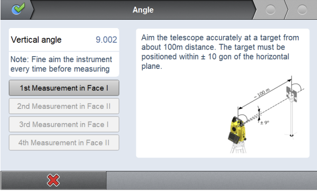 • Press the measurement keys to measure and to continue to the next step. Motorised instruments change automatically to the other face.