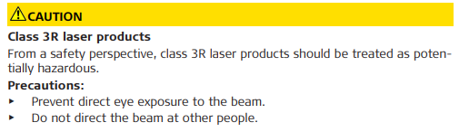 Direct intrabeam viewing may be hazardous (low eye hazard level), in particular for deliberate ocular exposure. The beam may cause dazzle, flash-blindness and after-images, particularly under low ambient light conditions. The risk of injury for laser class 3R products is limited because of:
