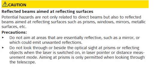 General: The EDM module built into the product produces a visible laser beam which emerges from the telescope objective.