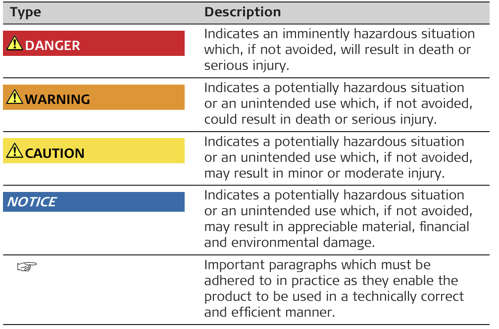 DANGER, WARNING, CAUTION and NOTICE are standardised signal words for identifying levels of hazards and risks related to personal injury and property damage. For your safety, it is important to read and fully understand the following table with the different signal words and their definitions! Supplementary safety information symbols may be placed within a warning message
