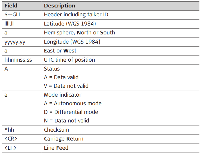 Syntax: $--GLL,llll.ll,a,yyyyy.yy,a,hhmmss.ss,A,a*hh<CR><LF>