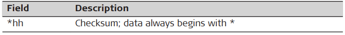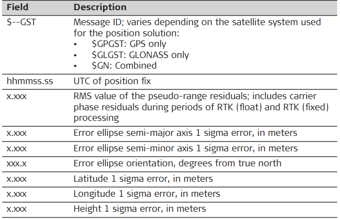 A.10 GST - Position Error Statistics Syntax: $--GST,hhmmss.ss,x.xxx,x.xxx,x.xxx,xxx.x,x.xxx,x.xxx,x.xxx*hh Description of fields Example $GPGST,172814.0,0.006,0.023,0.020,273.6,0.023,0.020,0.031*6A