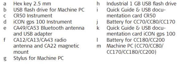 iCON gps 100 Dual GNSS Container 2.2.1 MTC1410 Container upper shell The large-size MTC1410 container comprises all items for a Dual GNSS configuration. MTC1410 container lower shell Large-size MTC1410 container configuration with Machine PC.