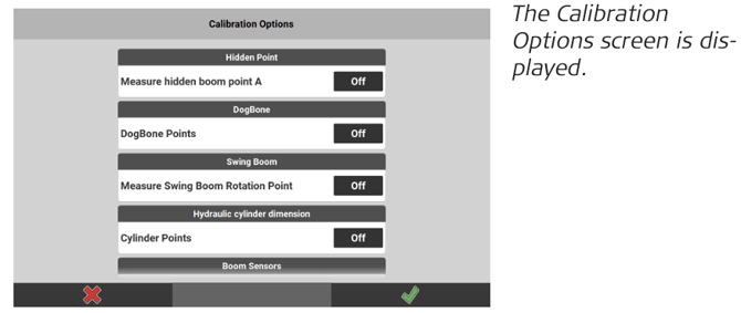 - If you want to calibrate the excavator including the additional options, set the desired option to On. For more information, refer to Additional Calibration Options for Excavators.