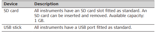 ➜ While other SD cards/USB sticks can be used, Leica Geosystems recommends to only use Leica SD cards/USB sticks and is not responsible for data loss or any other error that can occur while