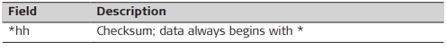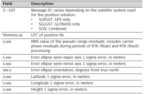 A.10 GST - Position Error Statistics Syntax: $--GST,hhmmss.ss,x.xxx,x.xxx,x.xxx,xxx.x,x.xxx,x.xxx,x.xxx*hh Description of fields Example: $GPGST,172814.0,0.006,0.023,0.020,273.6,0.023,0.020,0.031*6A