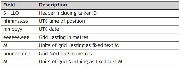 Syntax: $--LLQ,hhmmss.ss,mmddyy,eeeeee.eee,M,nnnnnn.nnn,M,x,xx,x.x,x.x,M*hh<CR><LF>
