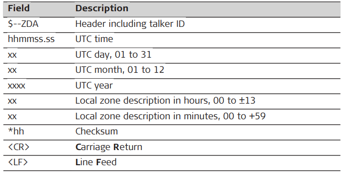 Syntax: $--ZDA,hhmmss.ss,xx,xx,xxxx,xx,xx*hh<CR><LF>
