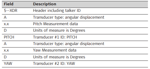A.20 XDR – Transducer Measurements Syntax: $--XDR,A,x.x,D,PITCH,A,x.x,A,YAW*hh<CR><LF> Description of fields Examples Standard Talker ID$GPXDR,A,0.071,D,PITCH,A,228.132,D,YAW*5E
