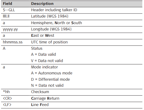 Syntax: $--GLL,llll.ll,a,yyyyy.yy,a,hhmmss.ss,A,a*hh<CR><LF>