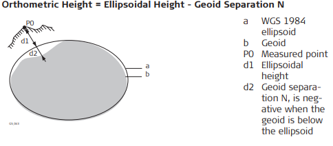 Description: GPS operates on the WGS 1984 ellipsoid and all heights obtained by measuring baselines are ellipsoidal heights. Existing heights are usually orthometric heights, also called height above the geoid, height above mean sea level or levelled height. The mean sea level corresponds to a surface known as the geoid. The relation between ellipsoidal height and orthometric height is