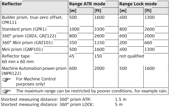 • The accuracy with which the position of a prism can be determined with Automatic Target Aiming (ATR) depends on several factors such as internal ATR accuracy, instrument angle accuracy, prism type, selected EDM measuring program and the external measuring conditions. The ATR has a basic standard deviation level of ± 1 mm. Above a certain distance, the instrument angle accuracy predominates and takes over the standard deviation of the ATR.