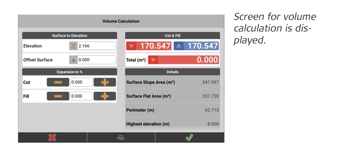 • If needed adapt the Expansion for Cut, Fill or both values: enter a positive (= swell) or negative (= shrink) percentage value of the calculated volume. The calculated volume is adapted immediately - Tap