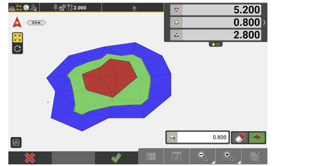All parts within the tolerance band are displayed in green, cut or fill segments are shown matching the Cut/Fill colour indicators. By default, the tolerance value is set to 10% of the difference between the maximum Cut and the maximum Fill value. - Tap