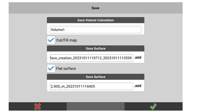 • Tap to select Cut/Fill map if you want to store the colour coded surface and the Cut/Fill lines as an XML file for further usage.