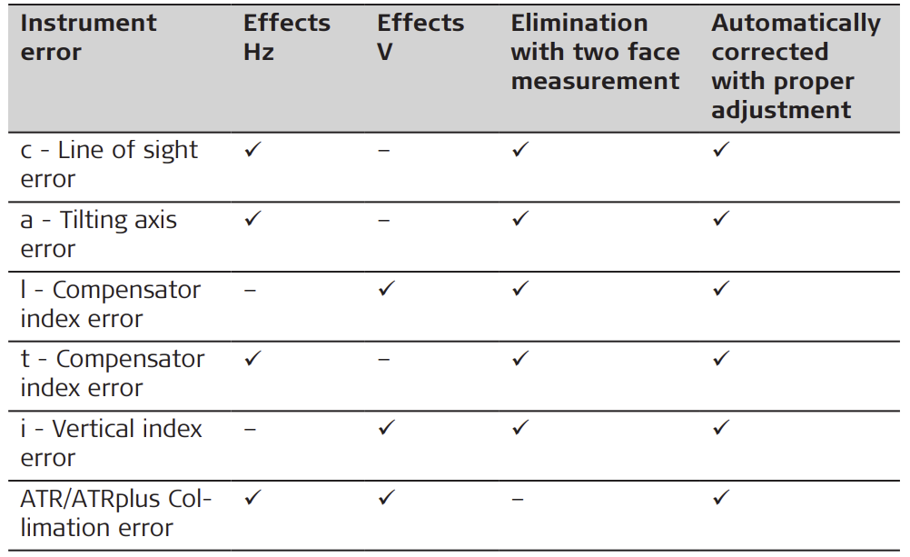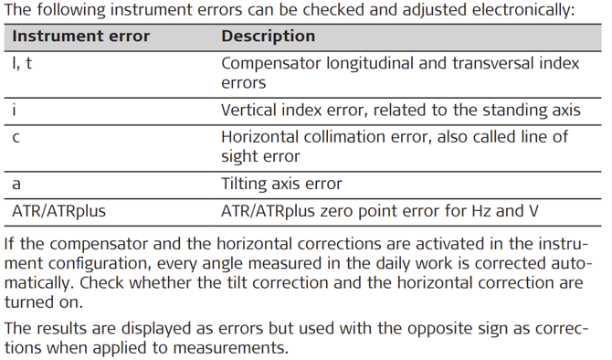 Description: Leica Geosystems instruments are manufactured, assembled and adjusted to the best possible quality. Quick temperature changes, shock or stress can cause deviations and decrease the instrument accuracy. It is therefore recommended to check and adjust the instrument from time to time. This check and adjust can be done in the field by running through specific measurement procedures. The procedures are guided and must be followed carefully and precisely as described in the following chapters. Some other instrument errors and mechanical parts can be adjusted mechanically.