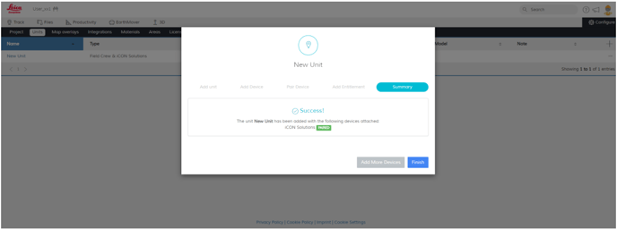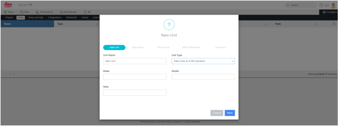 ☞ To use this functionality an account is needed for the Leica ConX web page. The licence is handled on the controller. Ask your ABTech representative for information about licencing and how to get an account. - Now create a Unit: