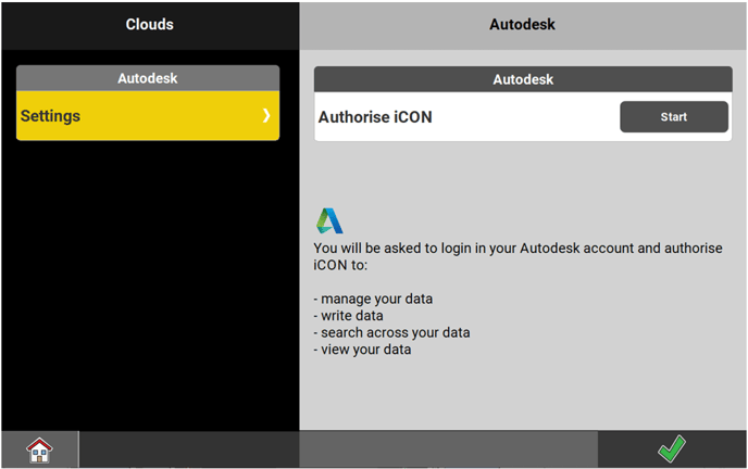 In the background, the iCON software receives an authentication token which is given to the Autodesk server to get a refresh token. The refresh token is saved in the Projects folder in iCON. - The Start button changes to Logout.
