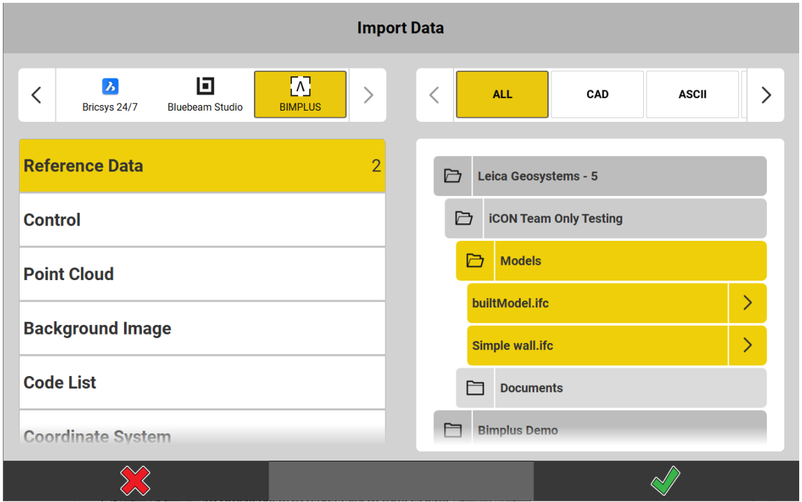 - In iCON select BIMPLUS as data source for import. The iCON software detects the teams and project folders on your BIMPLUS account. Open a team/project folder and select file(s) and/or model(s) from one or more sub-folders.