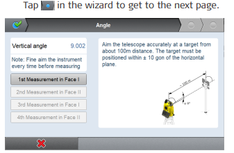 Follow the wizard which guides through the calibration. - • Aim the telescope accurately at a target at about 100 m distant. The target must be positioned within ± 9°/± 10 gon of the horizontal plane.