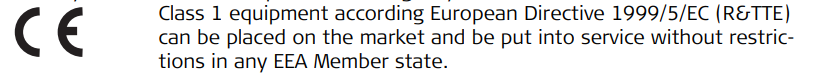 • Hereby, Leica Geosystems AG, declares that the CommunicationHandle is in compliance with the essential requirements and other relevant provisions of Directive 1999/5/EC and other applicable European Directives. The declaration of conformity may be consulted at http://www.leica-geosystems.com/ce.