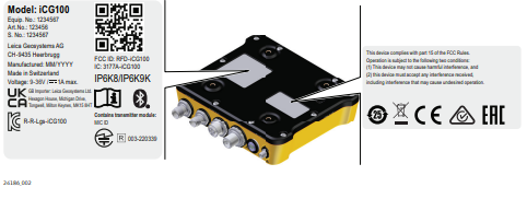 Hereby, Leica Geosystems AG declares that the radio equipment type iCON gps 100 is in compliance with Directive 2014/53/EU and other applicable European Directives. The full text of the EU declaration of conformity is available at the following Internet address: http://www.leica-geosystems.com/ce.