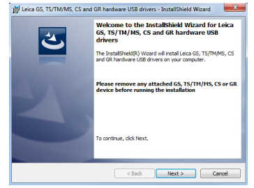 ➜ The setup has to be run only once for all Leica devices. - The Welcome to InstallShield Wizard for Leica GS, TS/TM/MS, CS and GR USB drivers window appears.