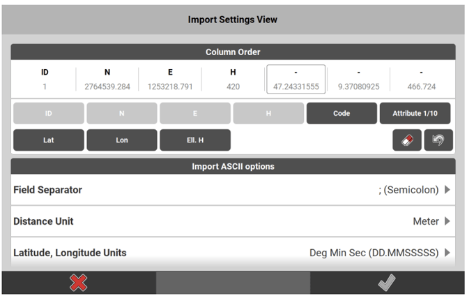 next to the file to be imported. (The Import Settings View is displayed) - Define the content of each column by tapping the buttons. Ensure that Easting, Northing and Height as well as Latitude, Longitude and Ellipsoidal Height are assigned correctly to the relevant columns.