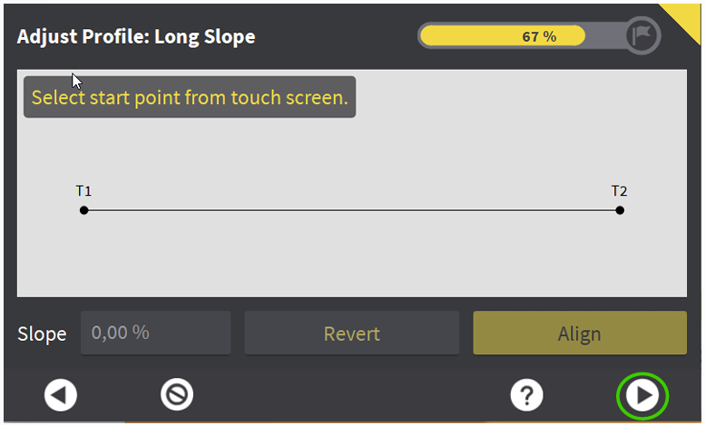 Adjust the Long Slope of the alignment. This will be pitch of your road/swale/trench. You can manually adjust the slope of each segment between points which were logged, or you can hit align which will interpolate the slope between the start and end point for one consistent slope. Hit arrow to proceed.