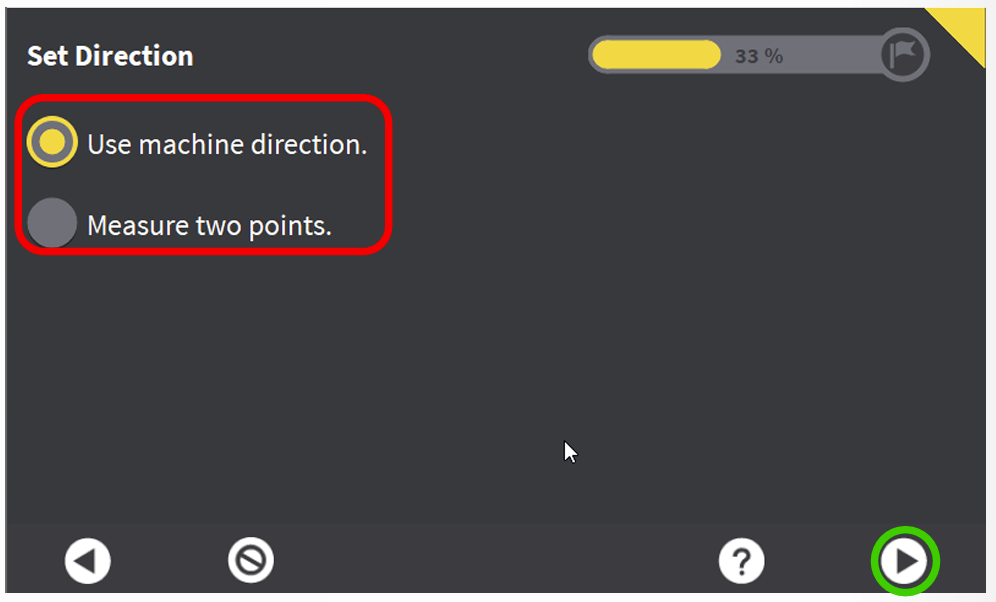 Define the method in which you would like to Set Direction of the X-Axis. You can use the current machine orientation as the X-Axis, or you can measure two points with the bucket/blade.