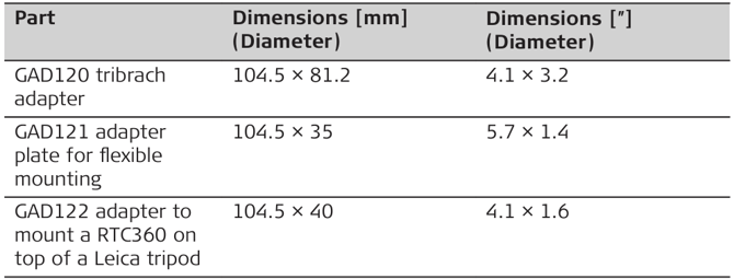 Dimensions 5.6 Dimensions RTC360/RTC360 LT laser scanner: GAD120 tribrach adapter: GAD121 adapter plate for flexible mounting: GAD122 adapter to mount a RTC360 on top of a Leica tripod: GZT21 Leica B/W 4.5" target on a GRT144 carrier: