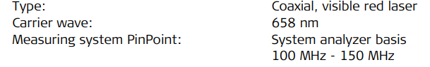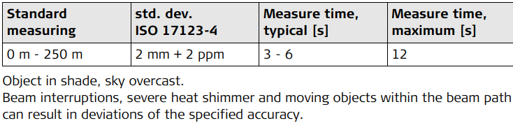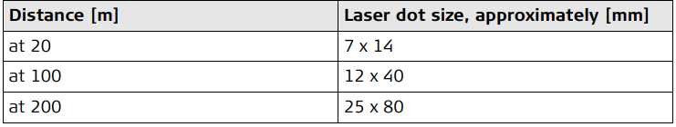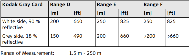 Distance Measurement without Reflectors (RL mode) 7.3 Range Atmospheric conditions D: Object in strong sunlight, severe heat shimmerE: Object in shade, sky overcastF: Underground, night and twilight Accuracy Characteristics Laser dot size