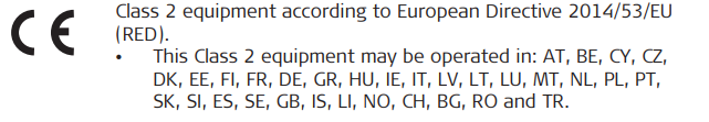 • The conformity for countries with other national regulations not covered by the FCC part 15 and 90 or European Directive 2014/53/EU has to be approved prior to use and operation.