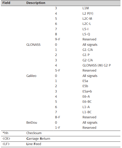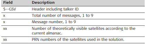 ➜ The fields for the PRN / Slot number, Elevation, Azimuth and SNR form one set. A variable number of these sets are allowed up to a maximum of four sets per message.