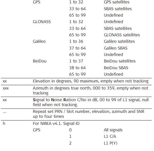Syntax: $--GSV,x,x,xx,xx,xx,xxx,xx,.....,h*hh