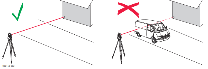 When a distance measurement is triggered, the EDM measures to the object which is in the beam path at that moment. If a temporary obstruction, for example a passing vehicle, heavy rain, fog or snow is between the instrument and the point to be measured, the EDM may measure to the obstruction.