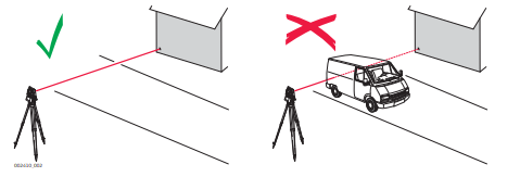 ➜ When a distance measurement is triggered, the EDM measures to the object which is in the beam path at that moment. If a temporary obstruction, for example a passing vehicle, heavy rain, fog or snow is between the instrument and the point to be measured, the EDM may measure to the obstruction.
