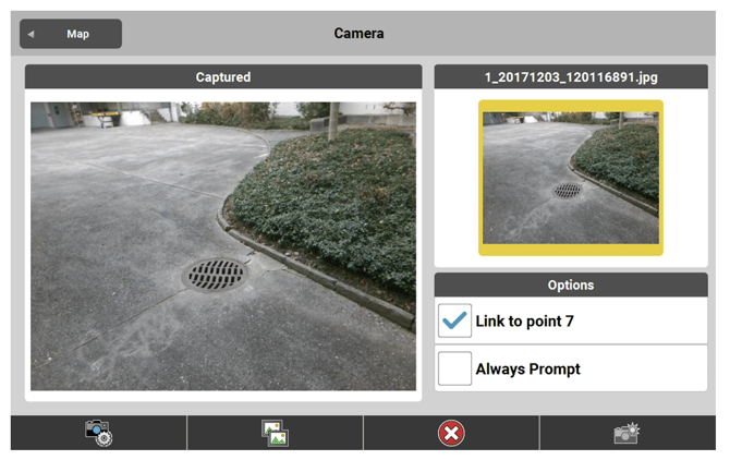 Link to point %1 ( (Point number of last stored point is displayed.) Activate the checkbox to link the captured Always Prompt Activate the checkbox to display the Camera screen automatically each time a point is stored.