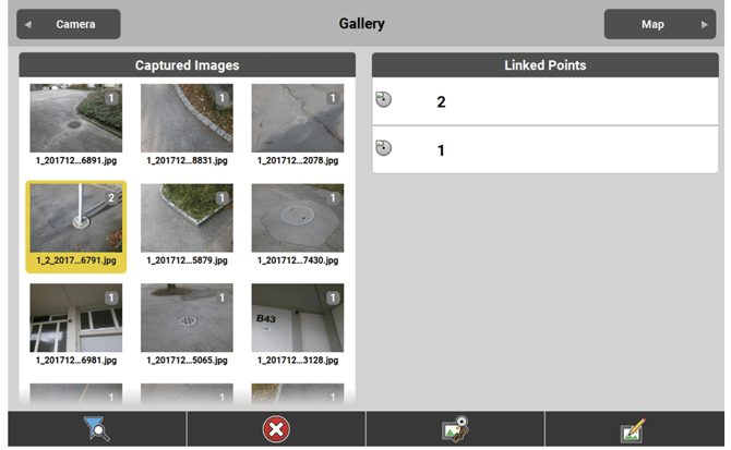 - In the Gallery screen, tap the image. (The selected image is highlighted in yellow. If the image is already linked to points, these points are listed in the Linked Points container).