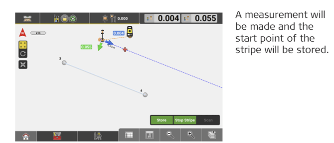- Aim the instrument at the first point of the stripe and tap Start. A measurement will be made. Tap Store to store the start point of the stripe.