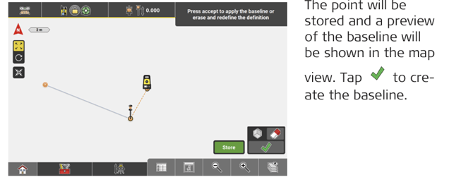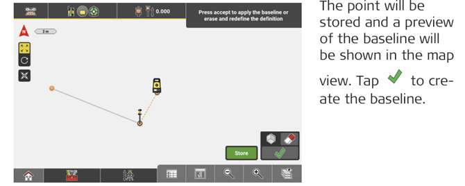 [The baseline is started already when you access the app.] - Tap and accept an existing point or measure and accept the start point of the baseline. Then tap and accept a second existing point or measure and accept the end point of the baseline. Tap Stop Stripe and then