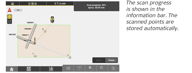 ➜ Alternatively, set up the instrument in a way that the leftover points can be scanned automatically. The instrument can be re-positioned any time as long as you stay in the same local coordinate system. Set up the instrument and tap Scan to resume point measurements. The instrument will find, measure and store the leftover points automatically.