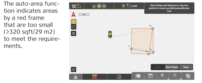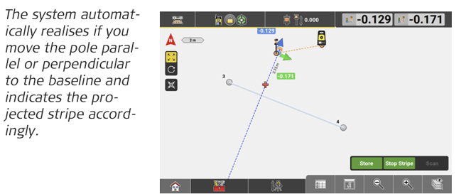 Once the baseline is defined there are two options to proceed. In both cases the system projects a stripe parallel or perpendicular to the baseline, depending on the direction of movement. The map view indicates the projected stripe by a dashed blue line. A red cross indicates the minimum length required for the stripe (11ft/3.35m). The red cross disappears when the minimum length requirement is fulfilled.