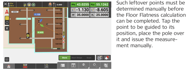Move the pole/aim the laser at a point less than 0.5m away from the first point . The system assumes that a stripe shall be determined while measuring point-by-point. Refer to: Check Floor Flatness and Floor Levelness by defining stripes while measuring |
