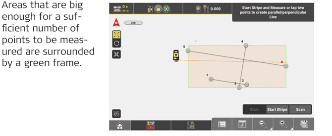 ➜ To measure the baseline and defined stripes in one go, the user will preferably use the Scan method. If necessary or wanted, measurements could also be taken using a reflector and methods can be mixed.
