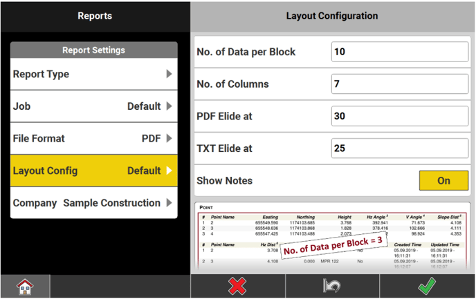 Tap Layout Config- No. of Data per Block: In the report, the information for a point is broken up into several lines. Define the number of points for which all information is shown before a new block of points begins.